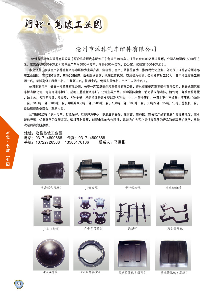 【详细信息】 沧州市源林汽车配件有限公司(原沧县宏源汽车配件厂)创建于1994年,注册资金1000万元人民币。公司占地面积15000平方米,建筑面积8000平方米(其中生产车间5000平方米,库房2000平方米,办公室,化验室1000平方米)。