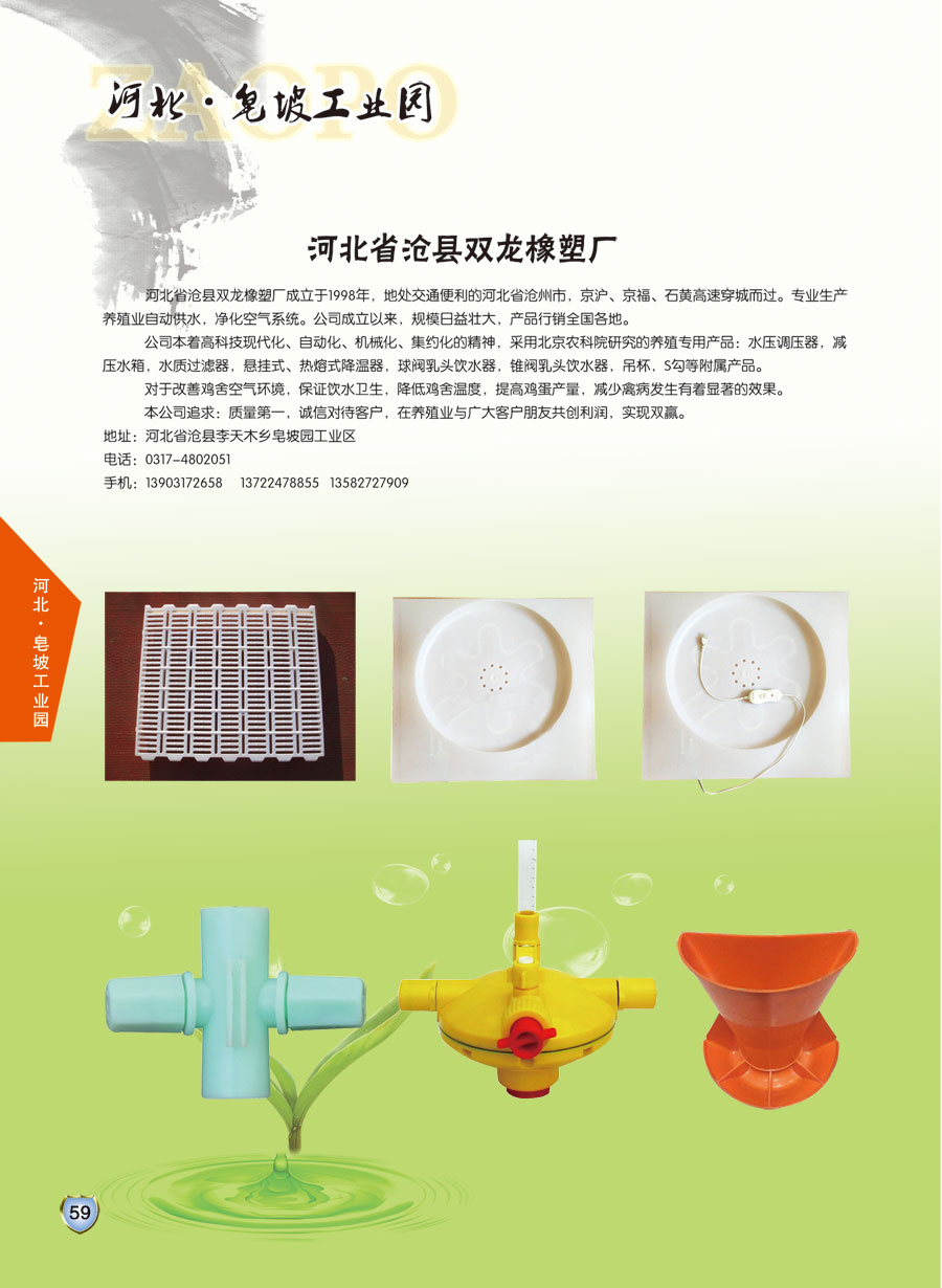 河北省沧县双龙橡塑厂成立于1998年,地处交通便利的河北省沧州市,京沪、京福、石黄高速穿城而过。专业生产养殖业自动供水,净化空气系统。公司成立以来,规模日益壮大,产品行销全国各地。